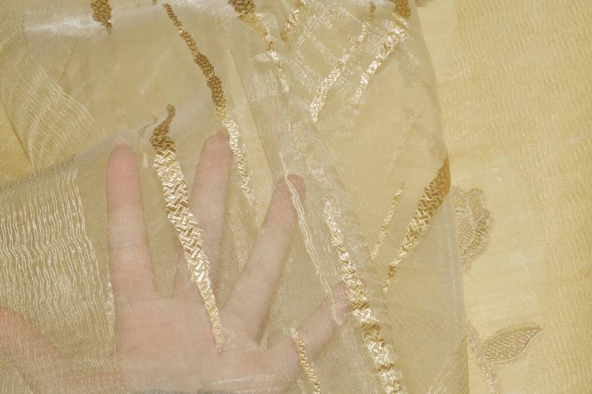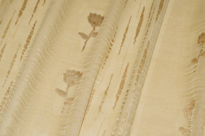 Tessuto con fondo beige in organza dall'aspetto semitrasparente, cadente e leggero, reso luminoso dalle striature e dai motivi floreali lucenti color oro chiaro. Semplice, ma raffinato è ideale per realizzare splendide tende arricciate di ogni tipo.