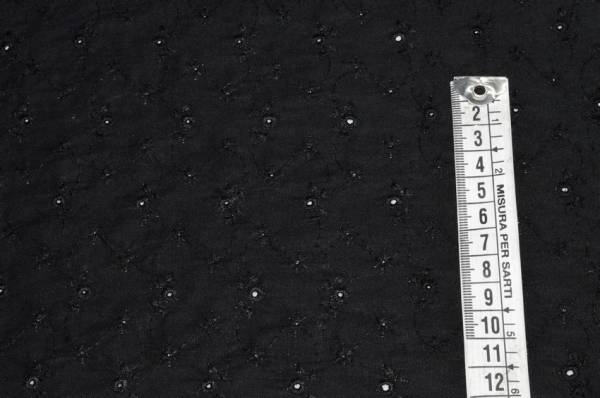 Tessuto di mano leggermente elasticizzata, leggera e piacevolmente fresca sulla pelle grazie alla sua composizione naturale in cotone. Il fondo si presenta a tinta unita nero, impreziosito dal delicato e minuzioso ricamo in tono. Utilizzato comodamente per la confezione di capi primaverili/estivi come graziose camicette ed abitini.