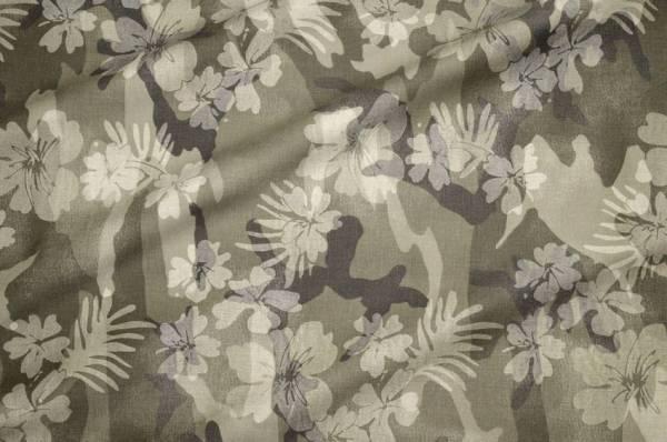 Tessuto gabardine in cotone dall'aspetto opaco e coprente unito ad una mano fresca e leggermente elasticizzata. La stoffa viene particolareggiata dalla fantasia floreale unita al fondo mimetico composto da diverde tonalità di verde militare e begie. Grazie al suo peso medio è ideale per realizzare capi d'abbigliamento primavera/estate come pantaloni sportivi e giubbettini.