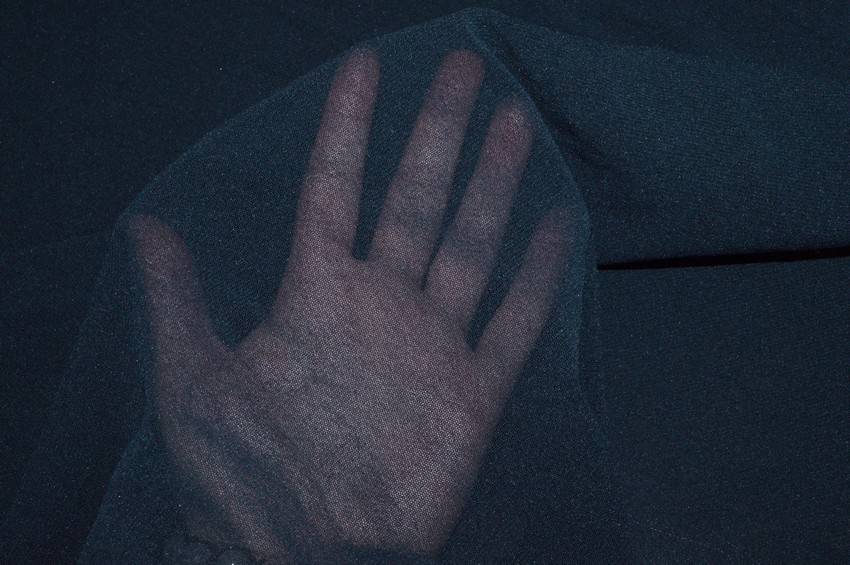 Tessuto tulle di mano morbida, leggera, cadente e bi-elastica con fondo blu trasparente, idoneo per abbigliamento aderente, inserti su abiti e costumi danza.