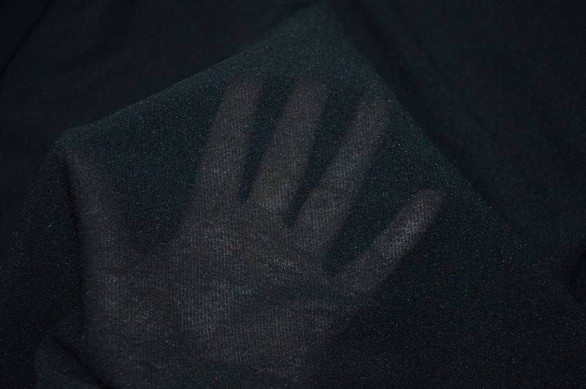 Tessuto tulle di mano morbida, leggera, cadente e bi-elastica con fondo nero semicoprente, idoneo per abbigliamento aderente, inserti su abiti e costumi danza.
