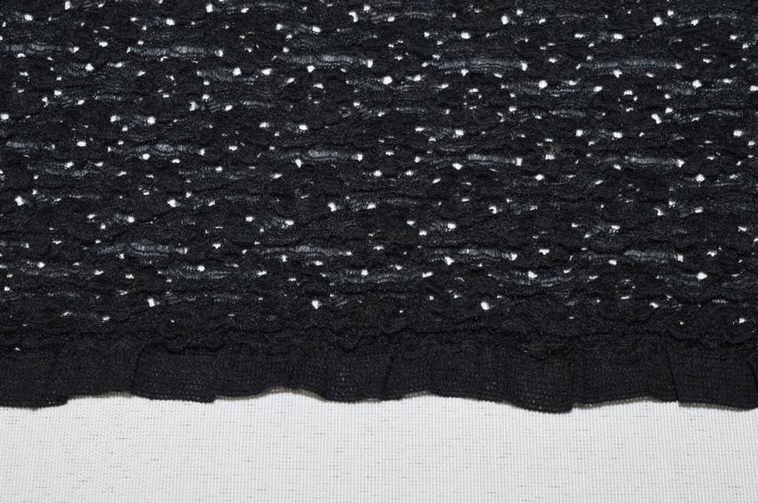 Tessuto di pizzo nero decorato dal delicato e minuzioso ricamo floreale di 1.8 cm circa. Presenta inoltre una sottile banda arricciata su entrambe le cimose. Di mano elasticizzata, cadente e leggera viene utilizzato per decorare o realizzare diversi capi d'abbigliamento primavera/estate quali abitini e top.