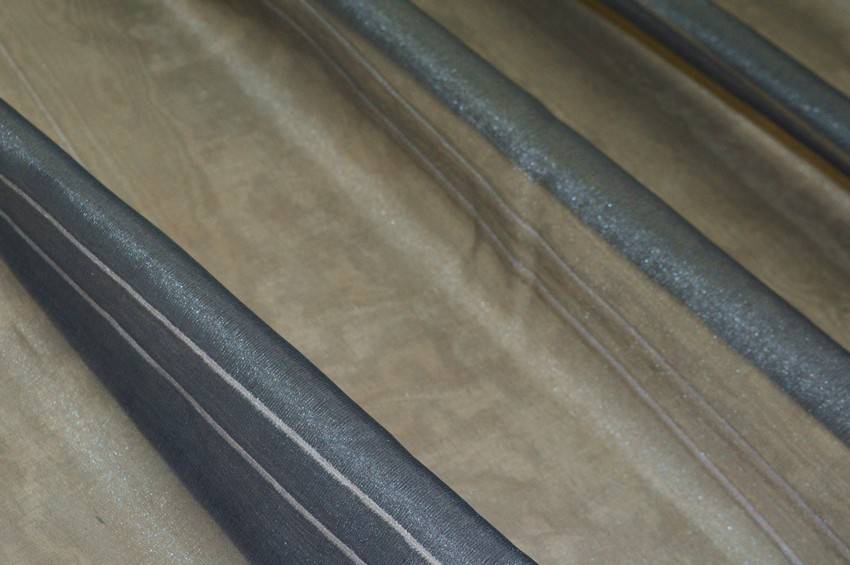 Particolare tessuto per tende composto da due strati di organza grigia (grigio caldo) uniti tra loro dalle sottili e delicate linee beige. La stoffa si presenta luminosa, cadente, leggera e molto trasparente, perfetta per arredare i propri spazi realizzando tente arricciate di ogni tipologia.