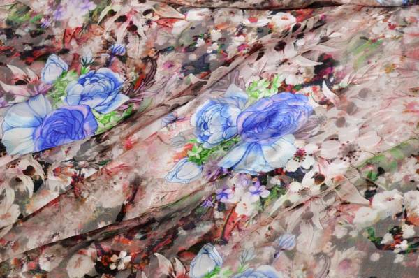 Il fondo semitrasparente viene impreziosito dall'elegante fantasia fiorata la quale mescola differenti gradazioni di rosa con elementi naturalistici azzurri a contrasto. Vi sono inoltre dei piccoli dettagli coprenti dall'aspetto luminoso, tipici dei tessuti devoreh.