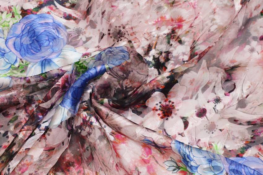 Il fondo semitrasparente viene impreziosito dall'elegante fantasia fiorata la quale mescola differenti gradazioni di rosa con elementi naturalistici azzurri a contrasto. Vi sono inoltre dei piccoli dettagli coprenti dall'aspetto luminoso, tipici dei tessuti devoreh.