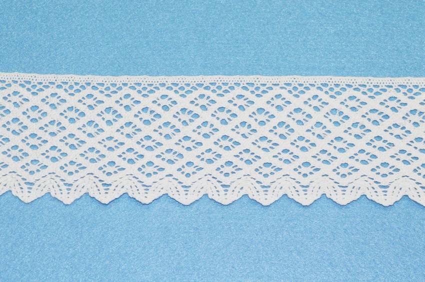 Pizzo in puro cotone bianco con incasso da 4 cm e due finali abbinati, il primo alto 5,5 cm ed il secondo alto 7,5 cm. Tutti e tre gli articoli si possono acquistare separatamente.