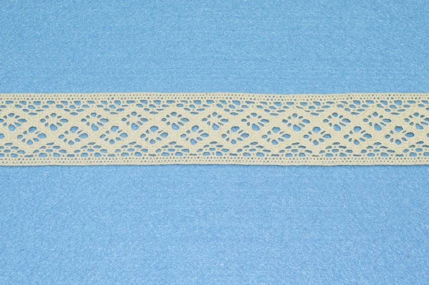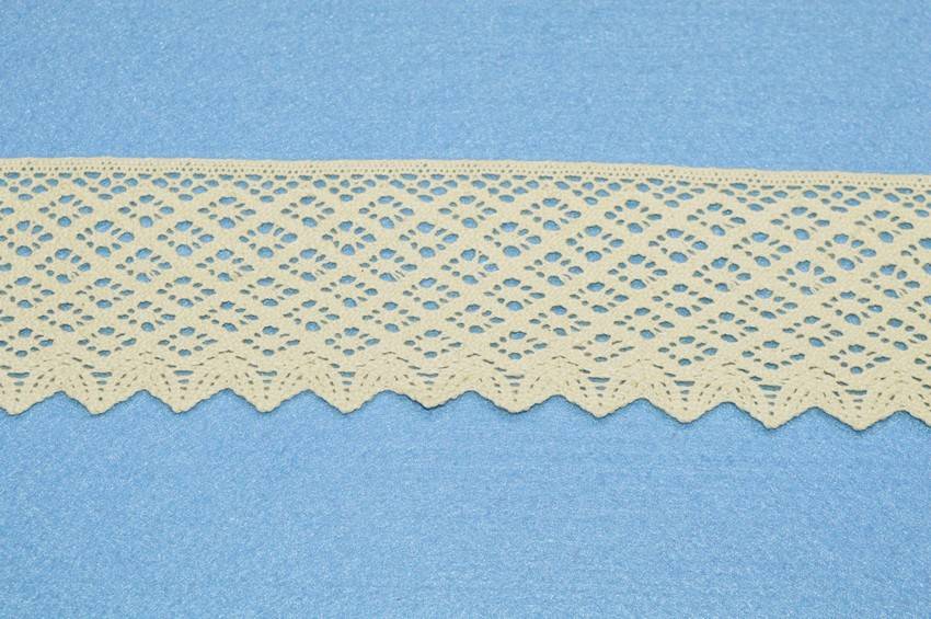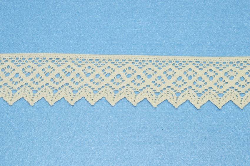 Pizzo in puro cotone panna con incasso da 4 cm e due finali abbinati, il primo alto 5,5 cm ed il secondo alto 7,5 cm. Tutti e tre gli articoli si possono acquistare separatamente.