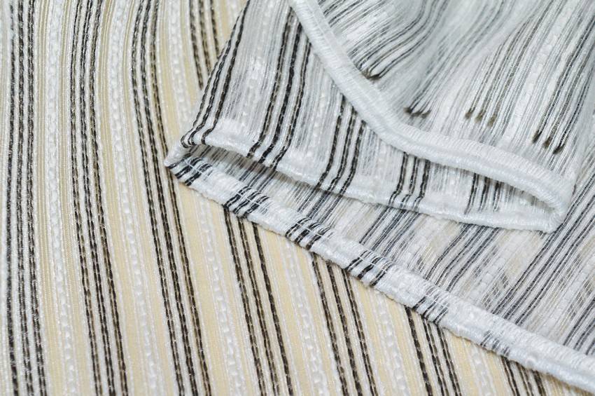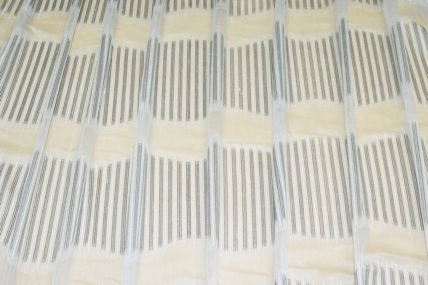 Tessuto per tende con elegante base grigio perla in organza leggera, cadente e semitrasparente. La fantasia presenta irregolari righe orizzontali composte a loro volta da sottili linee verticali nere e grigie ricamate. Ideale se si vuole realizzare moderne tende arricciate di ogni tipologia.