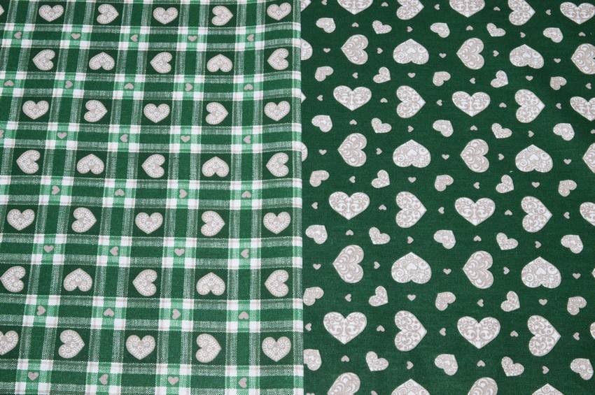 Tessuti realizzati interamente in puro cotone stampato coordinabili tra loro. Le due fantasie sono acquistabili anche separatamente. La prima presenta piccoli cuori di 1.5 cm e 4 cm circa su fondo verde, la seconda uno scozzese verde con quadri da 3x3.4 cm circa. Comodamente utilizzabili per lavori patchwork, piccoli lavori di arredo camerette, copricuscini e qualsiasi progetto fantasioso di cucito creativo come addobbi natalizi o oggettistica varia.