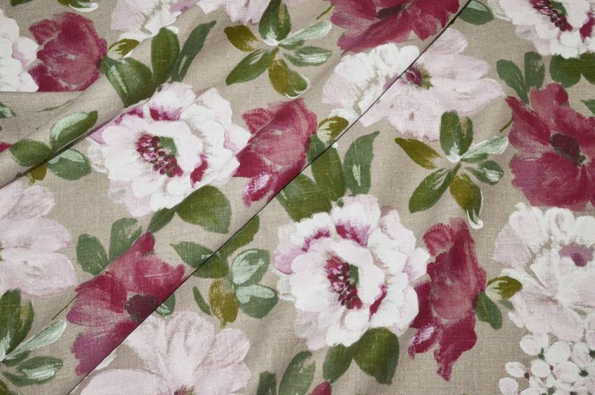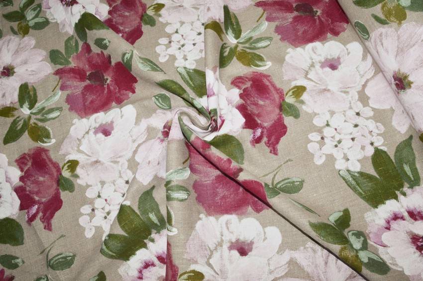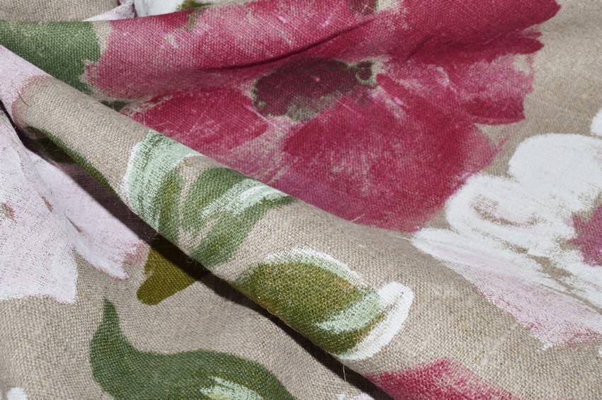 Splendido tessuto realizzato in bellissimo e prezioso puro lino di alta qualità con fondo grezzo/ecrù. La base viene impreziosita dall'importante disegno floreale composto da grandi fiori effetto dipinto. Utilizzato comodamente per splendide tovaglie, piccoli lavori di cucito creativo e progetti d'arredo vari come presine ed utensili vari.