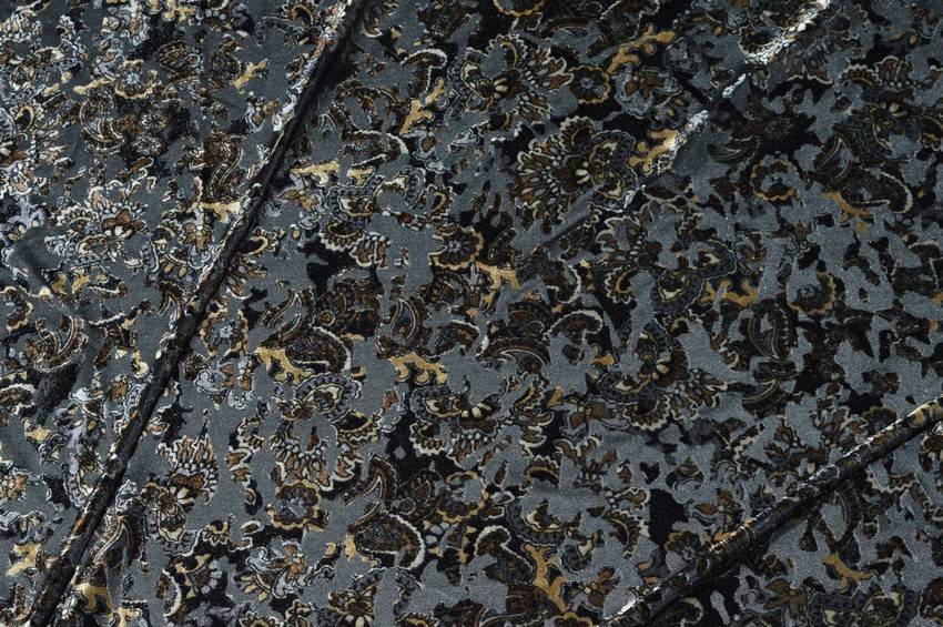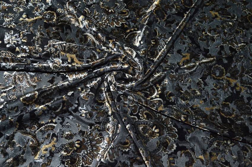 Vendita online tessuti abbigliamento georgette / chiffon dèvorè tessuto ciniglia devoreh fantasia cashmere nero oro - Tessuti & Stoffe