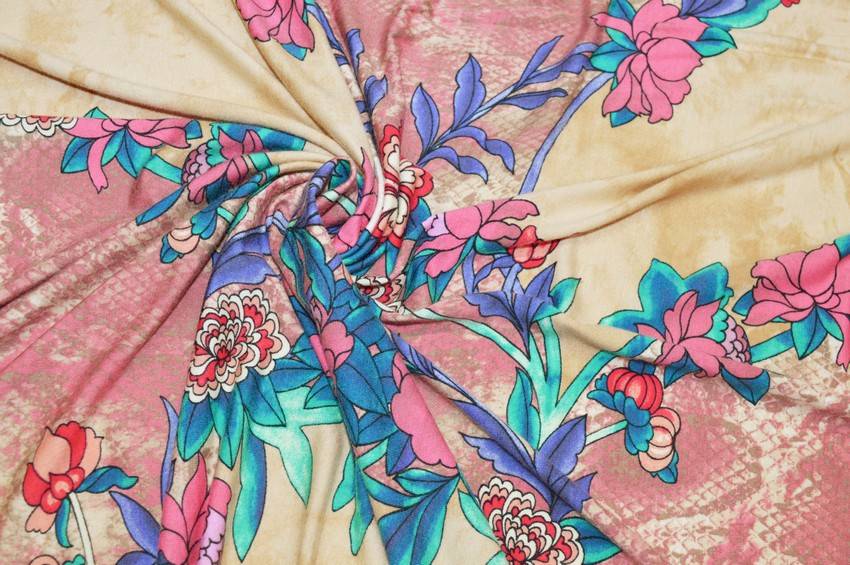 Tessuto di maglina in viscosa di mano elasticizzata, morbida, cadente e coprente. Il fondo presenta una colorazione irregolare beige composta dallo splendido effetto spatolato. A completare la stampa vi sono medaglioni floreali di differenti tonalità di rosa e verde. Ideale per confezionare capi d'abbigliamento estivi quali comode t-shirt, gonne lunghe, pantaloni morbidi e vestitini di svariati modelli.
