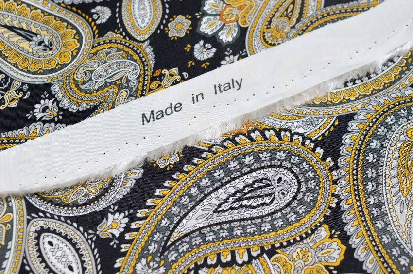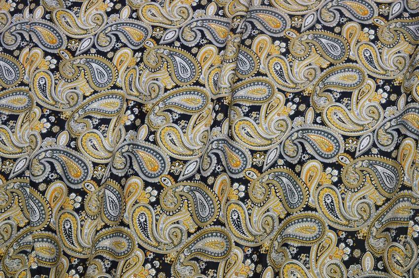 Ottimo tessuto 100%Made in Italy in pura viscosa di mano leggera, liscia, fresca e di media coprenza. Il fondo nero viene decorato dalla splendida fantasia boteh composta da differenti tonalità di grigio con delicati dettagli gialli a contrasto. Consigliato per la realizzazione di capi d'abbigliamento estivi quali scamiciate ed abitini.