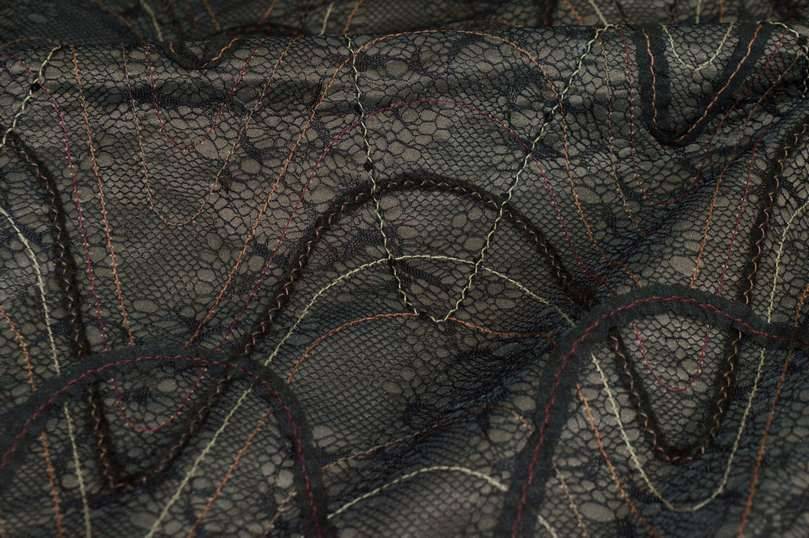 Elegante tessuto con fondo in taffetas dalla particolare colorazione bronzo composta dall'unione di due filati, beige e nero. La base viene inoltre decorata dalla graziosa applicazione retata nera unita a linee ondulate ricamate le quali donano unicità e movimento alla stoffa. La sua struttura rigida e sostenuta ne permette l'utilizzo per la realizzazione di capi d'abbigliamento elegante quali giacche ed abiti anche dai modelli voluminosi. Utilizzato anche per rivestimento esterno di cuscini.