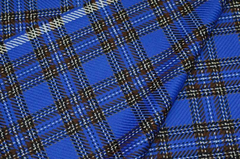 Tessuto scozzese bluette realizzato interamente in pura lana molto pettinato e caldo al tatto. Di medio peso è idoneo per realizzare molteplici capi d’abbigliamento come pantaloni, giacche, gonne, tailleur, abiti e gilet.
