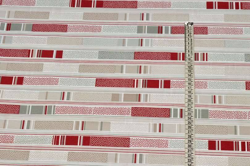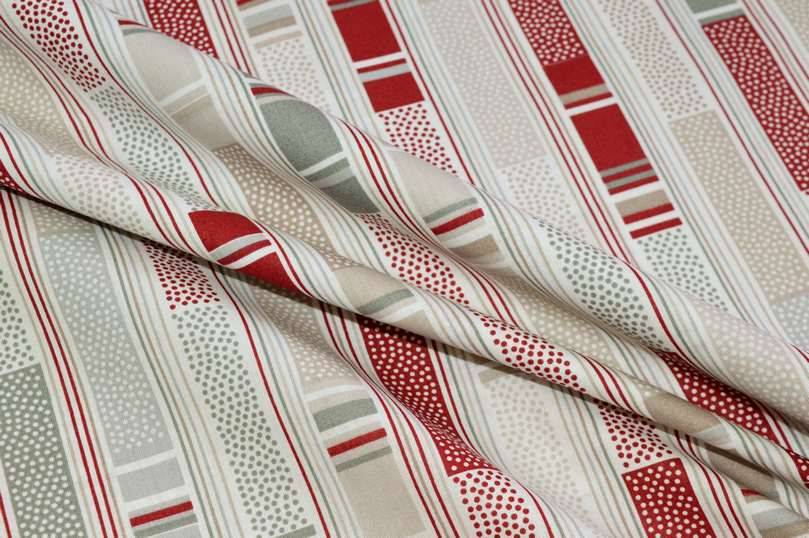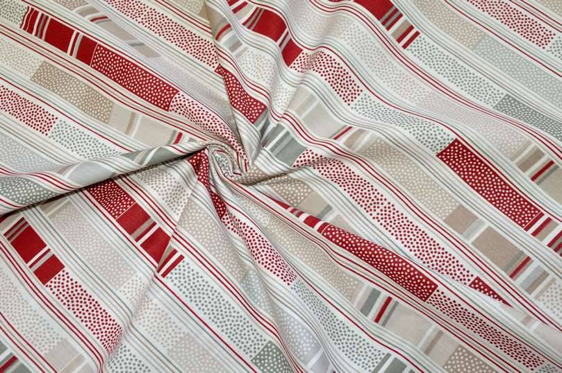 Tessuto in puro cotone dalla mano coprente e morbida. Il fondo chiaro assume un aspetto minimale e moderno grazie alla fantasia geometrica composta da rettangoli rossi, tortora e grigi di differente dimensione. Di pesantezza ideale per realizzare teli grandfoulard, rivestimento di cuscini, mantovane, lavori di cucito creativo, sacchi copripiumini e lenzuola.