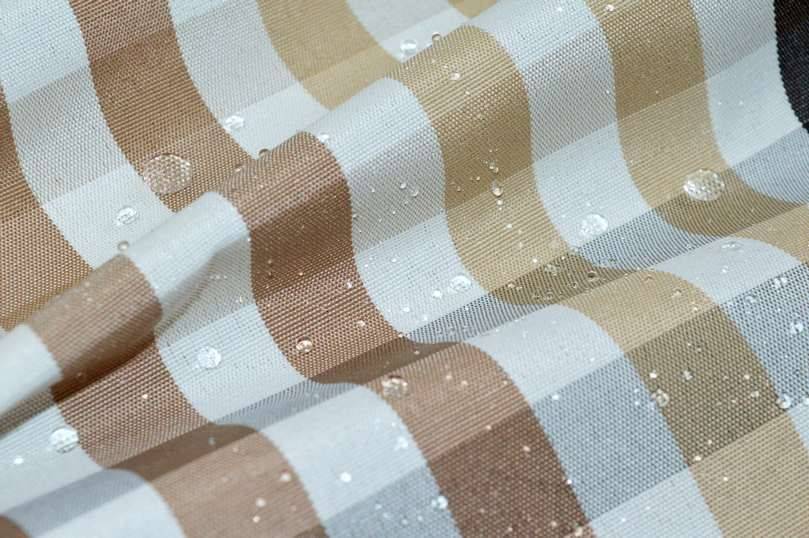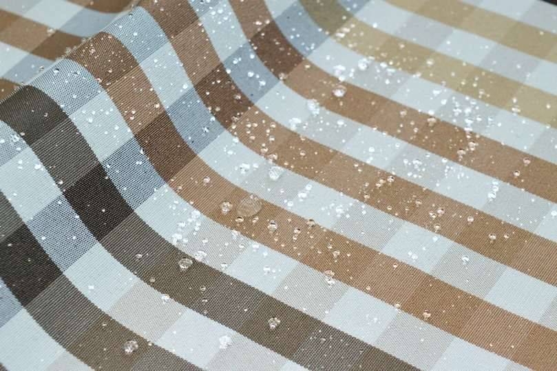 Tessuto poliestere/acrilico in altezza 140 cm, peso 250 gr al MTL,  con trattamento repellente al teflon che lo rende impermeabile e resistente alle macchie d'olio di sugo di vino ed a  qualsiasi altra macchia di natura grassa ed oleosa, si consiglia di pulire con un panno umido e di lavare periodicamente a massimo 30°.