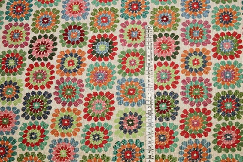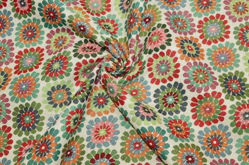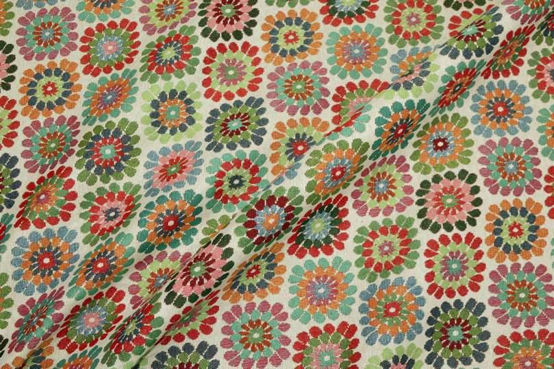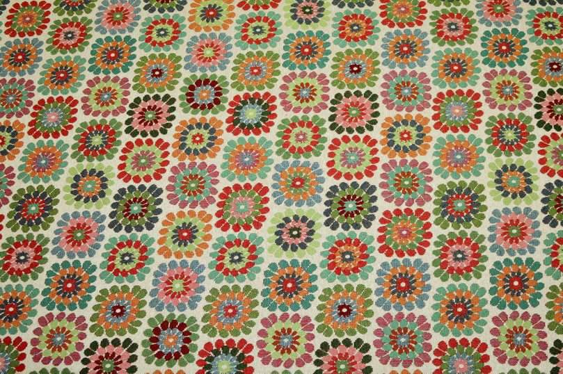 Vivace tessuto per lavori di arredo casa dalla mano resistente e robusta. Dona innovazione e colore agli spazi grazie alla contemporanea e ricercata fantasia multicolor su fondo chiaro la quale ricrea l'aspetto delle mattonelle ricamate. Puo essere utilizzato per realizzare meravigliosi gobelin e runner, accessori per la casa, cuscini, borse e decorazioni per la tavola.