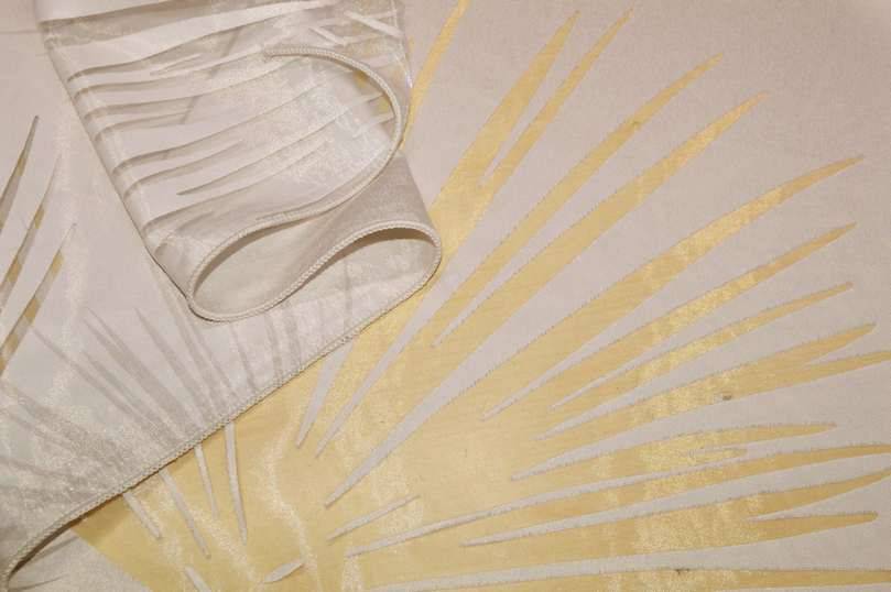 Una volta affisso alle pareti la stoffa risulterà molto cadente, leggera, di media coprenza e filtrante alla luce grazie ai dettagli in devoreh che caratterizzano il prodotto.