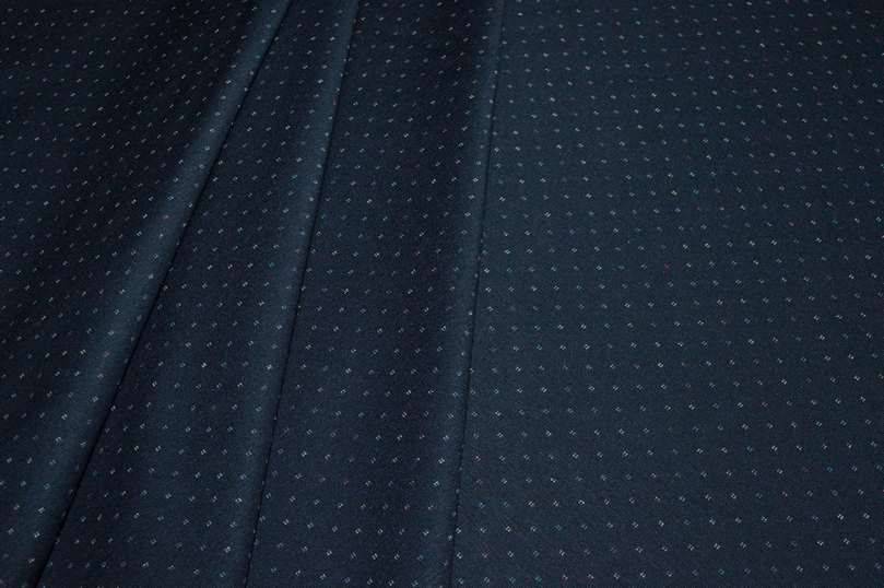 Tessuto di jersey dalla struttura sostenuta di mano morbida, calda ed estensibile da entrambi i versi. La stoffa si presenta con fondo interamente a tinta unita di una graziosa colorazione blu classica, ma ricercata impreziosita da micro pois multicolor. Consigliato l'utilizzo per la confezione di gonne, pantaloni, gilets ed abiti autunno/inverno.
