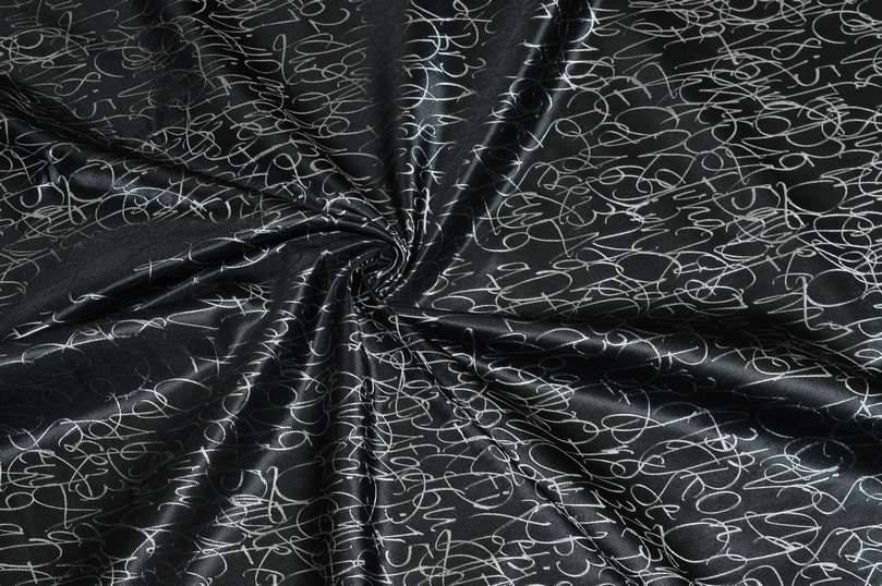 Tessuto di struttura sostenuta con fondo nero coprente e luminoso decorato a campo pieno dal motivo jacquard argentato raffigurante lettere e numeri. Di grammatura ottimale per la realizzazione di giacche, bolerini, abiti anche dai modelli ampi ed altre tipologie di capi d'abbigliamento elegante.