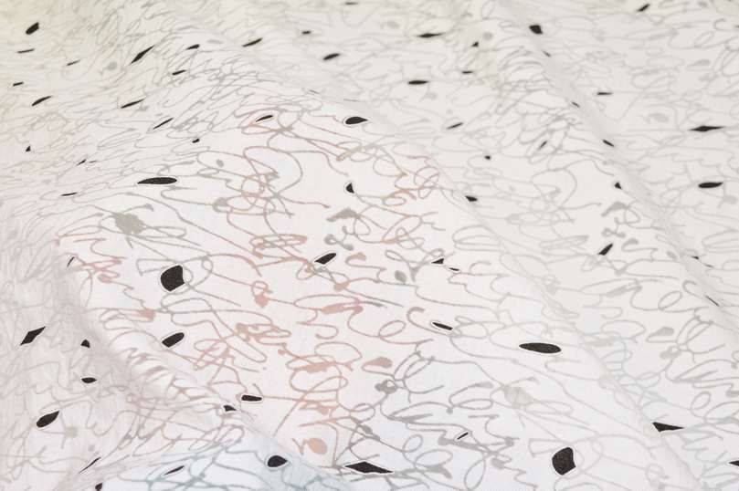 Tessuto realizzato in viscosa molto leggero e cadente al tatto. Il fondo si presenta delicato grazie alla sua colorazione bianco naturale (non bianco ottico, non giallino) unita alla caratteristica lavorazione trasparente che ricrea l'effetto vedo non vedo delle stoffe in devoreh. A completare il disegno vi sono piccole figure geometriche nere a contrasto. Ne viene consigliato l'utilizzo per confezionare raffinate camicette, graziosi foulard, stole coprispalle ed abitini. Idoneo anche per ricreare applicazioni su capi già confezionati come volant o balze.