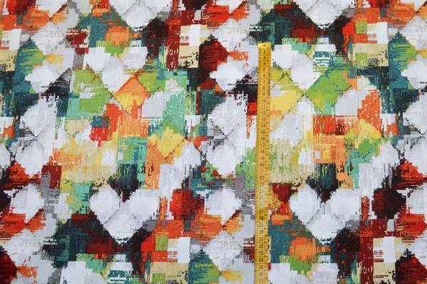 Tessuto con fantasia astratta composta da molteplici e brillanti tonalità di colori le quali creano un meraviglioso effetto multicolor. Consigliato l'utilizzo per la realizzazione di teli grand foulard, copridivani, copricuscini, copriletti, mantovane per copricassettoni, copritavoli e qualsiasi altra tipologia di lavori di cucito creativo vario.