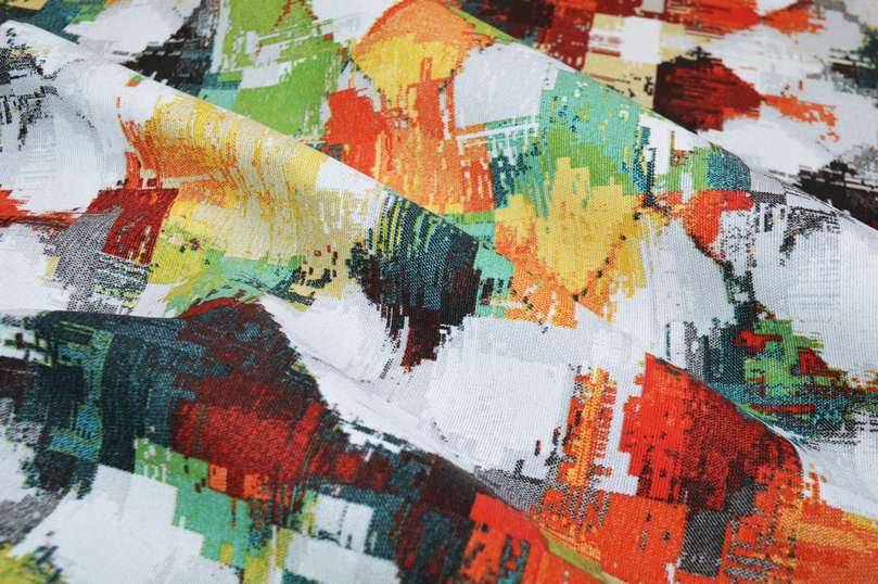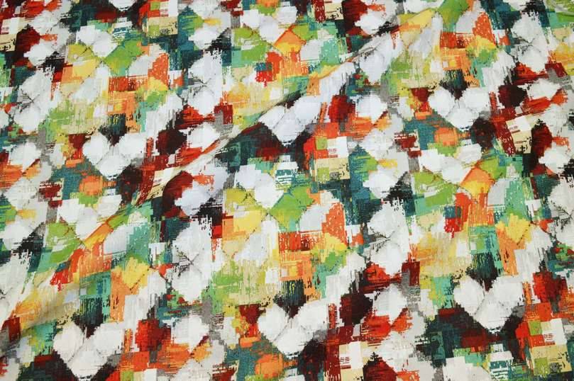 Tessuto con fantasia astratta composta da molteplici e brillanti tonalità di colori le quali creano un meraviglioso effetto multicolor. Consigliato l'utilizzo per la realizzazione di teli grand foulard, copridivani, copricuscini, copriletti, mantovane per copricassettoni, copritavoli e qualsiasi altra tipologia di lavori di cucito creativo vario.