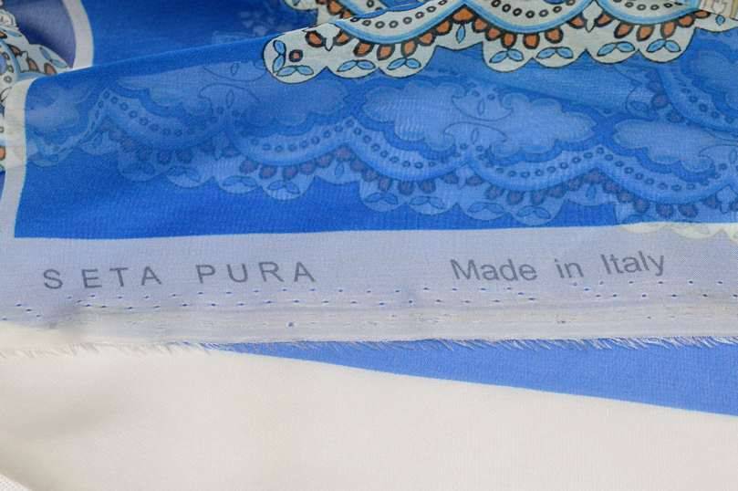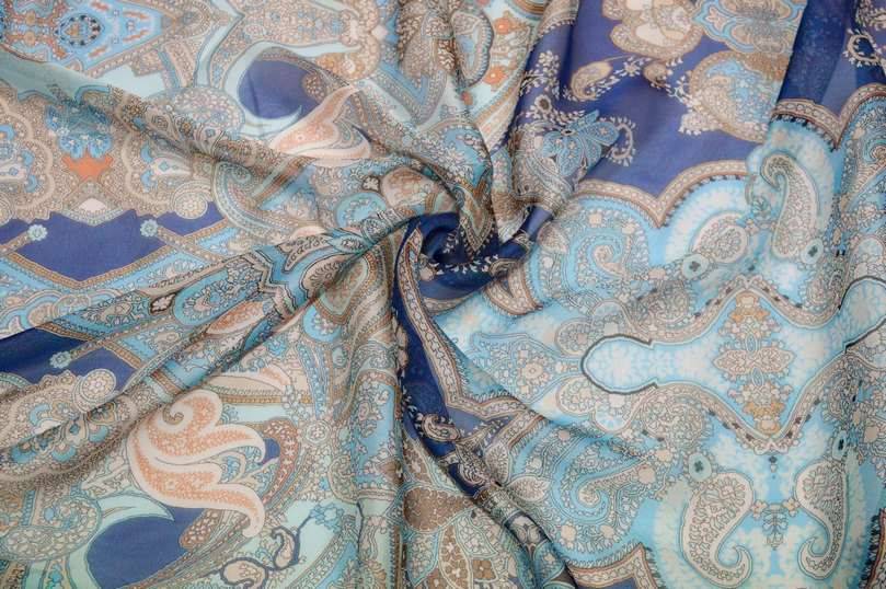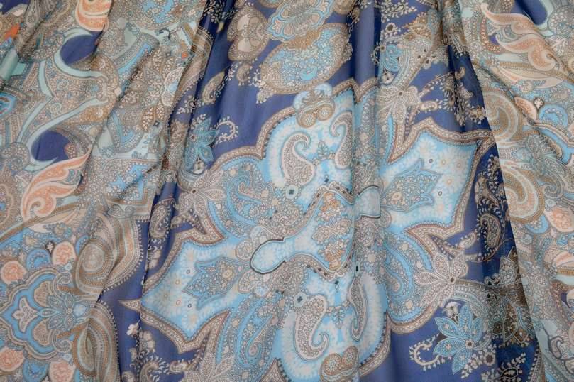 Bellissimo pannello in chiffon di altissima qualità, realizzato interamente in preziosa pura seta dalla mano molto trasparente, cadente, leggera e fresca. La base presenta una splendida fantasia piazzata di differenti gradazioni di azzurro e beige. Grazie alla sua leggerezza si presta perfettamente alla realizzazione di capi d'abbigliamento primavera/estate come abitini, top e camicette. Perfetto anche per eleganti foulard, coprispalle e stole.