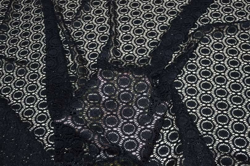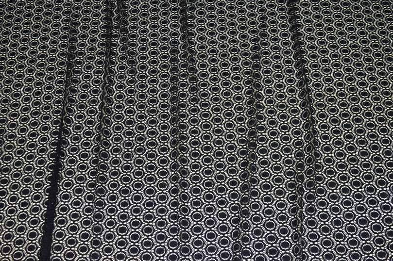 Tessuto di pizzo nero decorato a campo pieno dal minuzioso ricamo. Al tatto risulta di mano elasticizzata da entrambi i versi, cadente e leggera, utilizzato per abbigliamento primavera/estate come abitini e maglie. Idoneo anche per applicazioni su capi già confezionati.