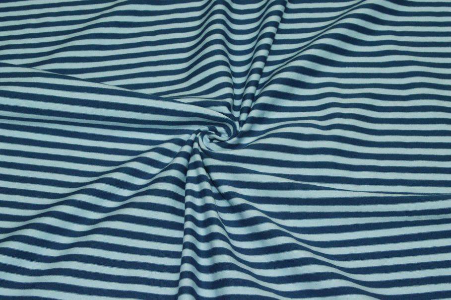 Con il 5% di elastan risulta inoltre elasticizzata da entrambi i versi, qualità che rende il prodotto molto versatile per ogni fisicità. A completare il design del prodotto vi è una rigatura verticale (da cimosa a cimosa) che alterna sottili linee azzurre e celesti. Misura righe 5 mm.