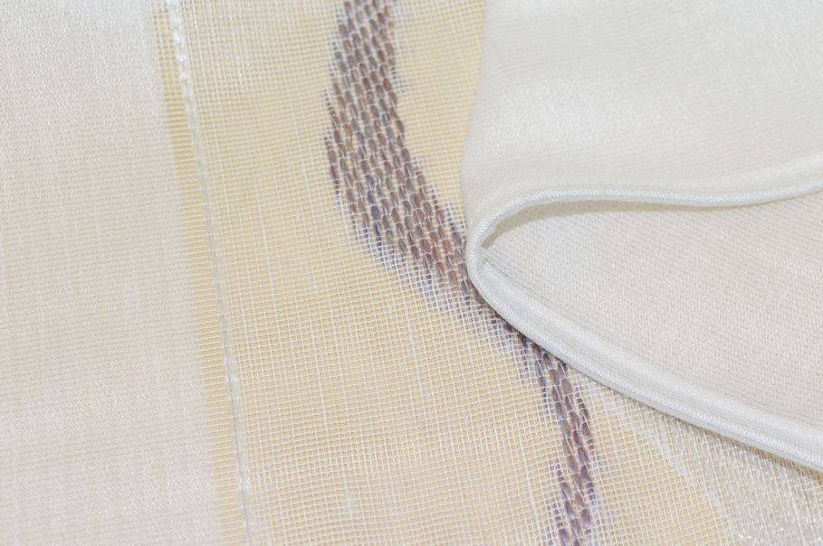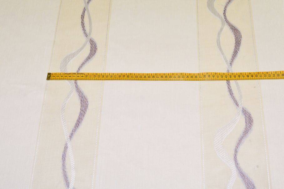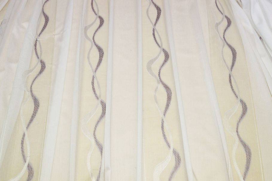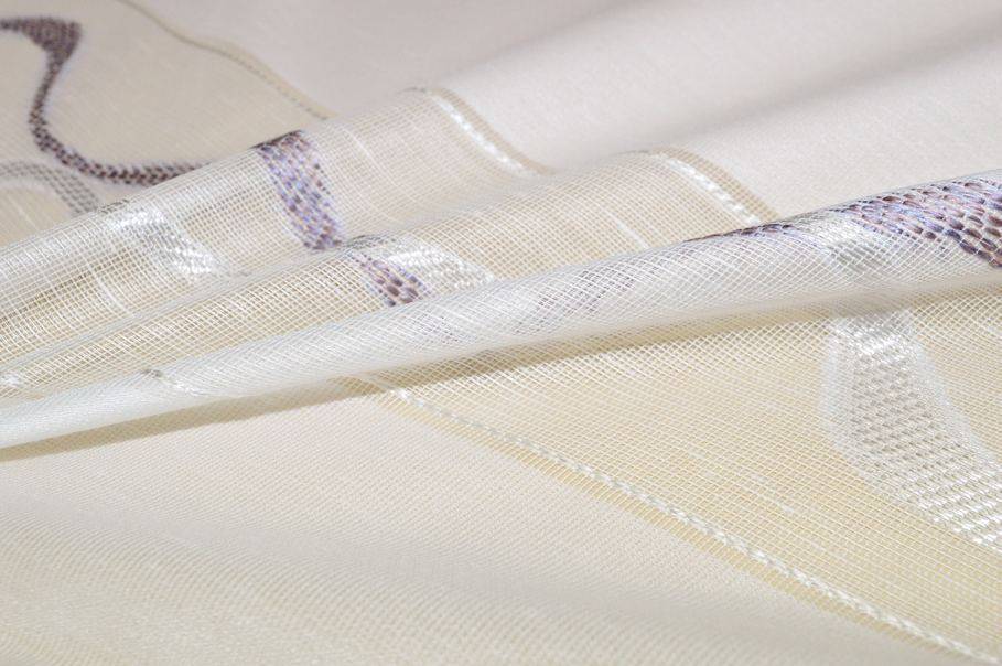 Tessuto per tende con cimosa parlata la quale riporta la provenienza 100%Made In Italy del prodotto. Il fondo bianco alterna fasce di coprenza differente permettendo alla luce di filtrare illuminando l'ambiente senza rinunciare alla privacy. A completare il motivo fantasia vi sono delicate linee ondulate bianche e lilla le quali offrono un prodotto di alto design. Cadente e leggera risulta ottimale per creare tende arricciate con morbide e sinuose onde.