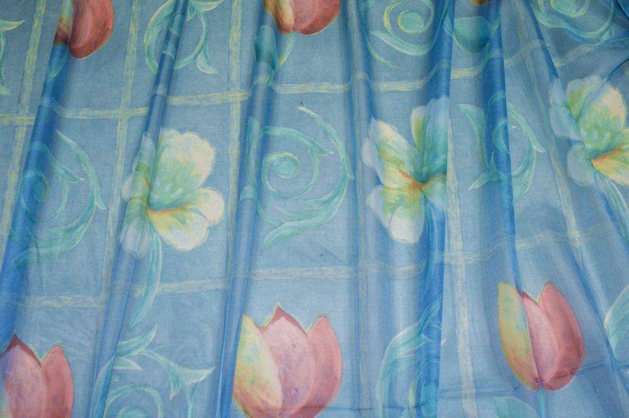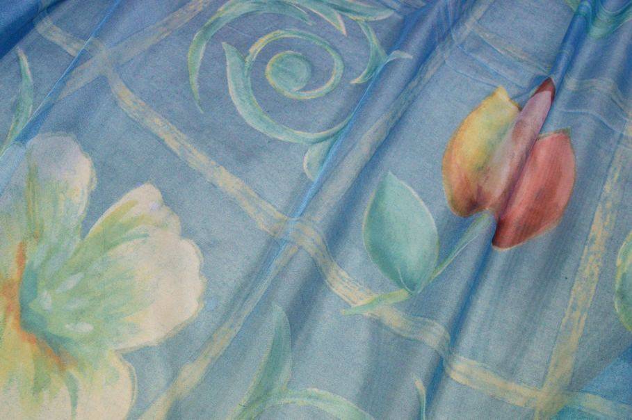 Velo di mano molto leggera e cadente ideato per la confezione di tendaggi, in particolare per tende arricciate dalle onde morbide e svolazzanti. Risulta inoltre molto trasparente, viene favorito negli ambienti con poca luce poiché permette di arredare gli spazi senza rinunciare alla luminosità. Il fondo viene particolareggiato dalla splendida tonalità di azzurro arricchito da importanti figure floreali in stile dipinto. Giocosa e colorata si sposa perfettamente con ambienti classici. Idoneo anche per camerette bimbo/a.