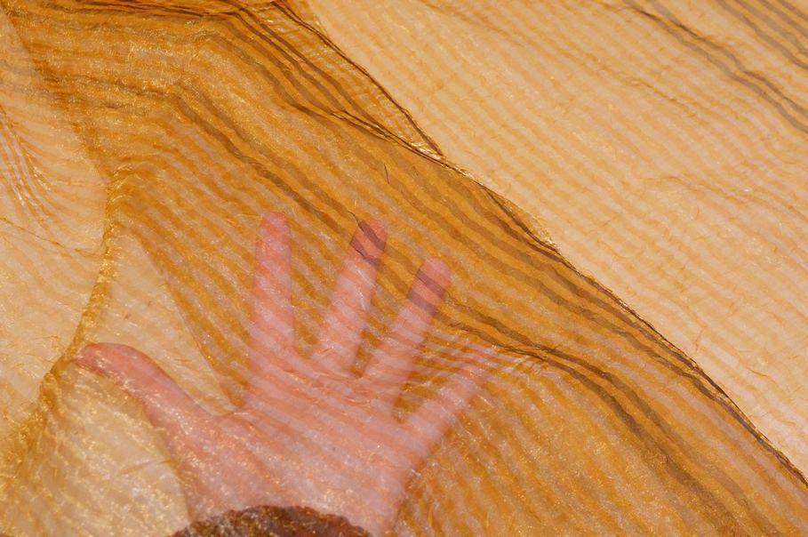 Tessuto in organza con effetto stropicciato dalla raffinata e preziosa colorazione dorata. Il tessuto nasce per la confezione di tendaggi, in particolare di tende arricciate, dall'aspetto molto cadente, leggero e trasparente. Il fondo dalla brillante colorazione viene arricchito ulteriormente dal delicato rigatino verticale in tono.