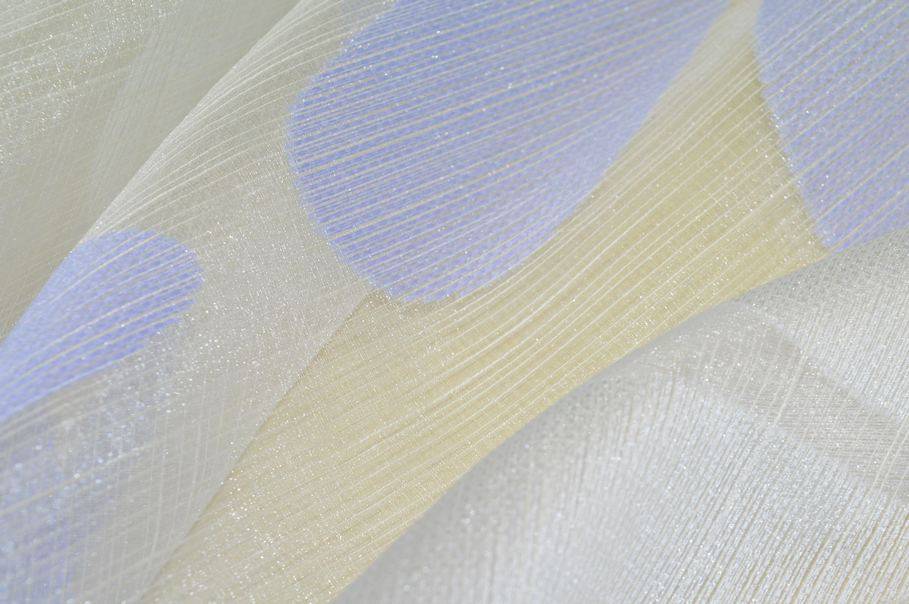 Splendido tessuto in organza con fondo molto leggero e trasparente color naturale, ottimo per lasciar filtrare la luce ed illuminare l'ambiente. Grazie alla sua composizione la stoffa non assume sgradevoli pieghe e stropicciature indesiderate. Ad impreziosire il fondo vi sono le bellissime figure fiorate color naturale e lilla creando un vero e proprio elemento d'arredo di idniscussa bellezza. Idoneo per realizzare ogni modello di tende arricciate. Piombato in fondo.