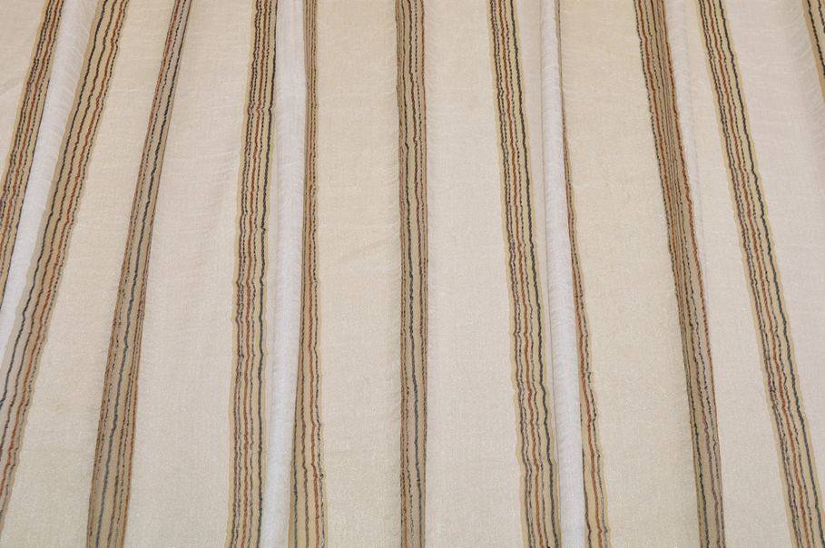 Il fondo panna risulta leggero, cadente ed abbastanza coprente, ma filtrante alla luce. Si aggiunge inoltre un grazioso effetto stropicciato composto da minuziose e delicate increspature tipiche di questa lavorazione. A completare la decorazione vi sono sottili ed irregolari linee verticali grigie e color bruciato. Distanza fasce 7 cm circa.