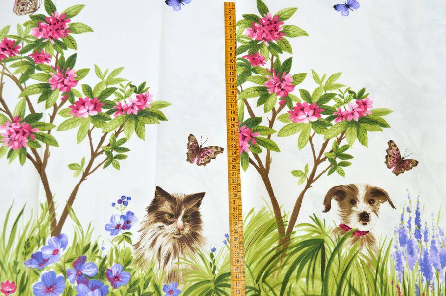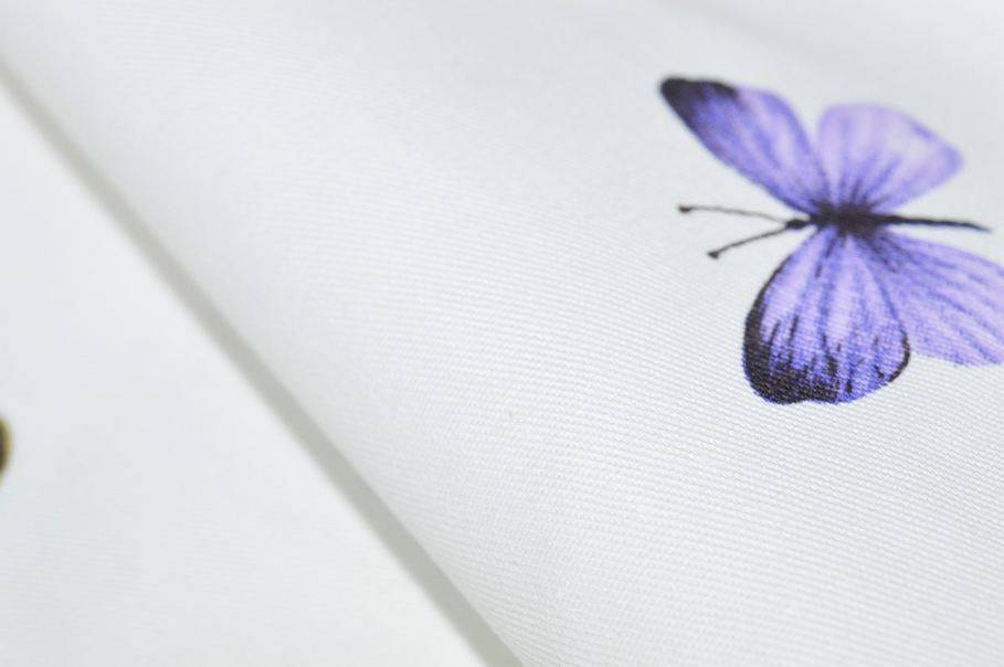 Il fondo bianco viene decorato da minute e graziose farfalle distribuite nella fascia centrale del tessuto. Ai lati vi sono invece due fasce con stampa decorativa a tema animali: su una cimosa sono raffigurati solamente gatti, nell'altra unicamente figure canine.