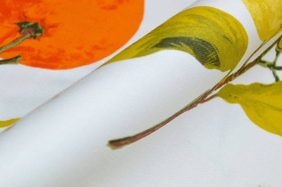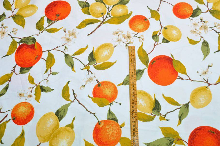 Splendido tessuto naturale realizzato interamente in puro cotone progettato per la confezione di tovagliati. Il fondo presenta una candida e raffinata colorazione bianca impreziosita dalla sgargiante e deliziosa illustrazione raffigurante varie tipologie di agrumi. Favorito anche per piccoli lavori di arredo cucina come presine, tovaglioli, tovagliette da colazione ed oggettistica ornamentale varia.