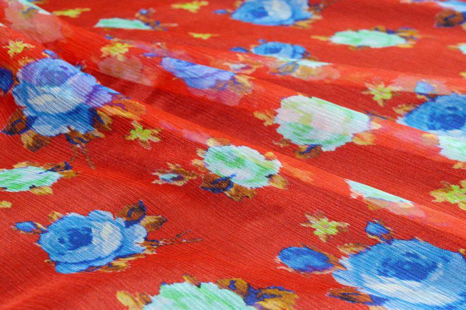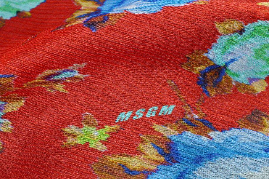 Tessuto chiffon di pura seta con logo MSGM distribuito sul fondo. L'articolo si presenta con un particolare effetto crepon caratterizzato dalla superficie a pieghe irregolari che gli conferiscono la tipica arricciatura delle stoffe plissettate. Il prodotto viene favorito per creazioni primaverili ed estive per merito della sua mano leggera, cadente, molto fresca e trasparente. La colorazione selezionata per il fondo è un vivace e vibrante rosso impreziosito da rose azzurre a contrasto per un design alla moda unico e giovanile. Grazie alla sua leggerezza viene scelto per capi d'abbigliamento primavera/estate quali abiti corti e lunghi, gonnelline con volant, camicette velate ed applicazioni come balze su indumenti già confezionati.