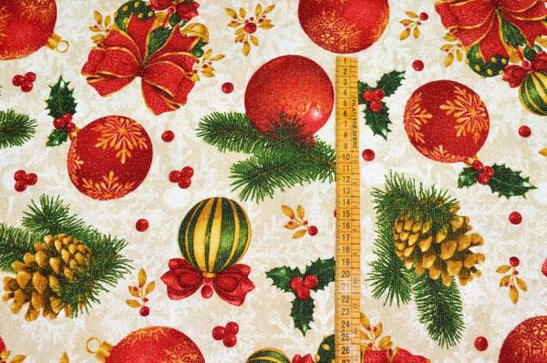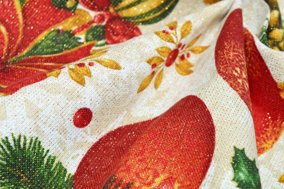 Splendido tessuto arredo in misto cotone con fantasia a tema natalizio composta da un delicato fondo sfumato beige e color naturale il quale mette in risalto le molteplici figure festive che lo compongono. La base neutra viene inoltre illuminata ed arricchita dal sottile filo lurex dorato che ne enfatizza l'aspetto allegro e festoso. Dai colori vivi e tradizionali è perfetto per decorare la propria casa.