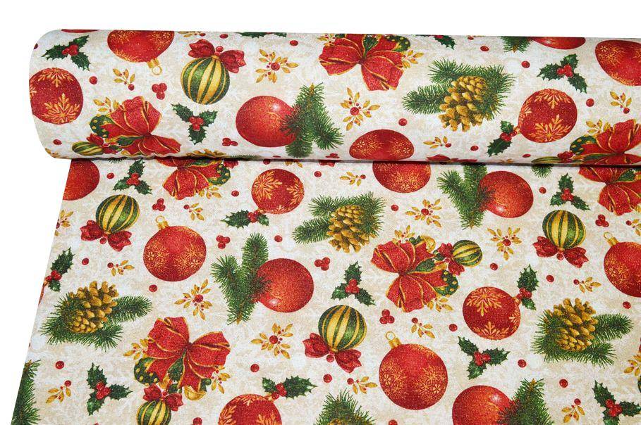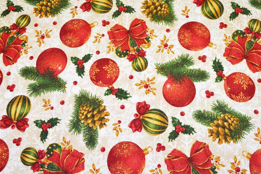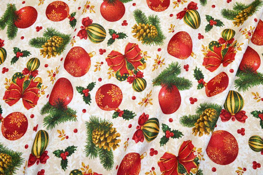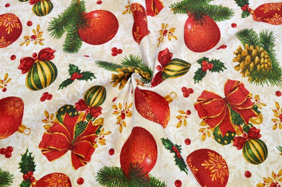 Splendido tessuto arredo in misto cotone con fantasia a tema natalizio composta da un delicato fondo sfumato beige e color naturale il quale mette in risalto le molteplici figure festive che lo compongono. La base neutra viene inoltre illuminata ed arricchita dal sottile filo lurex dorato che ne enfatizza l'aspetto allegro e festoso. Dai colori vivi e tradizionali è perfetto per decorare la propria casa.