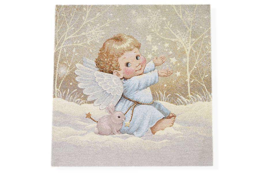 Tessuto fantasia a tema natalizio raffigurante un grazioso angioletto azzurro su sfondo innevato in Gobelin cm 47x47. Articolo utilizzato per realizzare graziosi copricuscini, sottopiatti, tovagliette e lavori di cucito creativo vario.