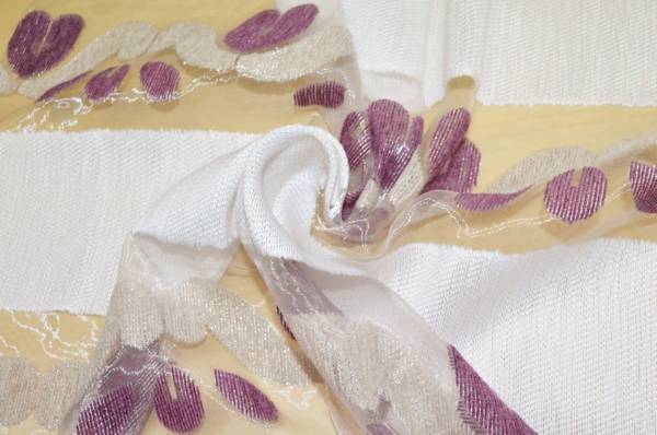Tessuto per tendaggi dal particolare design composto dall'unione di lavorazioni differenti. Il fondo mescola fasce bianche di media coprenza con linee in organza trasparenti. Ad arricchire le aree velate troviamo inoltre un prezioso ricamo viola e beige a contrasto.