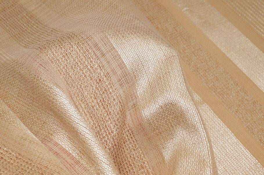 Tessuto idoneo per la realizzazione di tende arricciate amato per la sua mano leggera e cadente, perfetta per creare onde sinuose e morbide. Nella sua variante beige risulta essere un articolo di design molto raffinato ed elegante, arricchito dalle fasce verticali dorate che aggiungono un bellissimo scintillio alla stoffa.