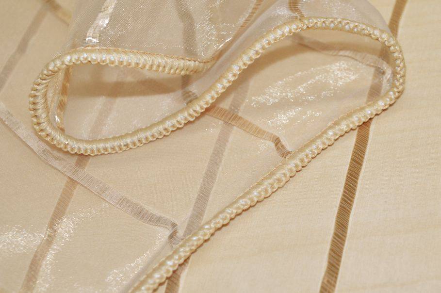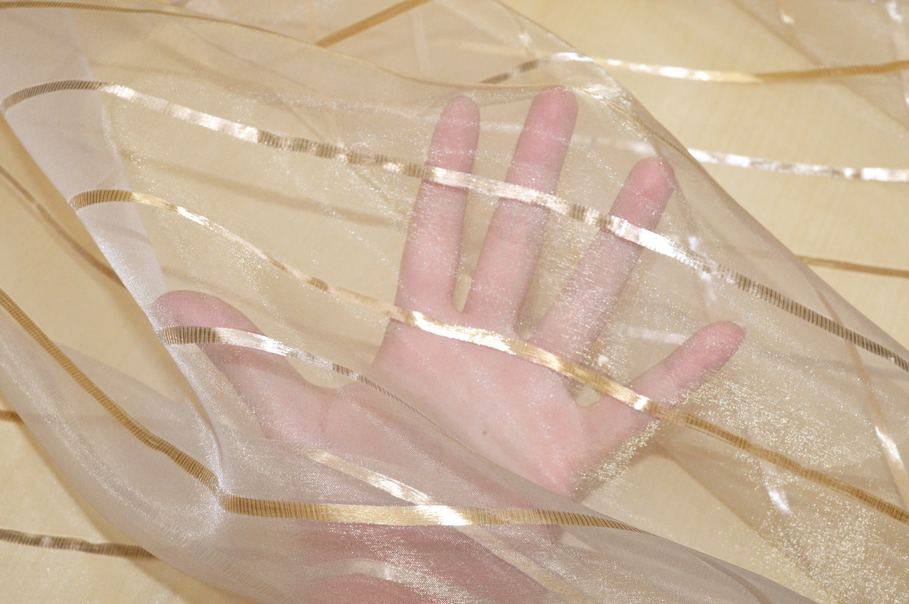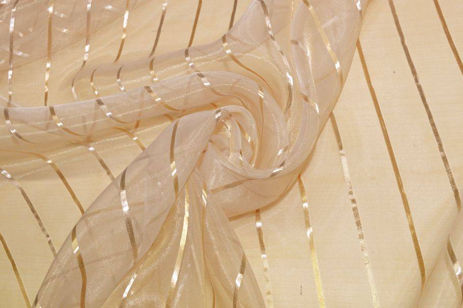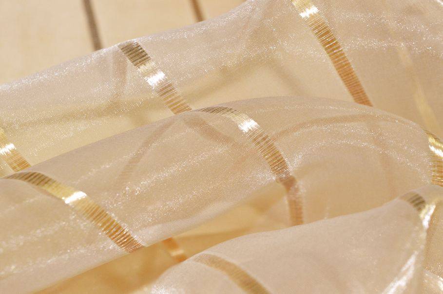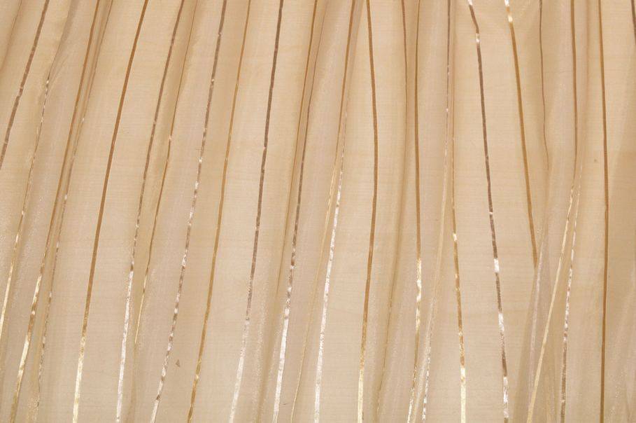 Bellissimo tessuto finalizzato alla realizzazione di tende dalle linee delicate e dolci, perfette per arricciature ricche e sinuose. Nella sua variante dorata risulta essere un dettaglio d'arredo altamente lussuoso e raffinato. Ad aumentarne l'eleganza troviamo sottili linee verticali dorate le quali aggiungono uno splendido scintillio alla stoffa. Realizzato con base in organza presenta una mano molto leggera e trasparente. La leggerezza del prodotto lo rende un articolo perfetto per arredare ambienti con poca illuminazione.